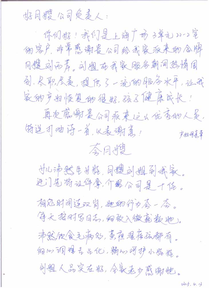 【發(fā)展故事】月嫂劉炳琴獲得客戶贈(zèng)予的感謝信一封