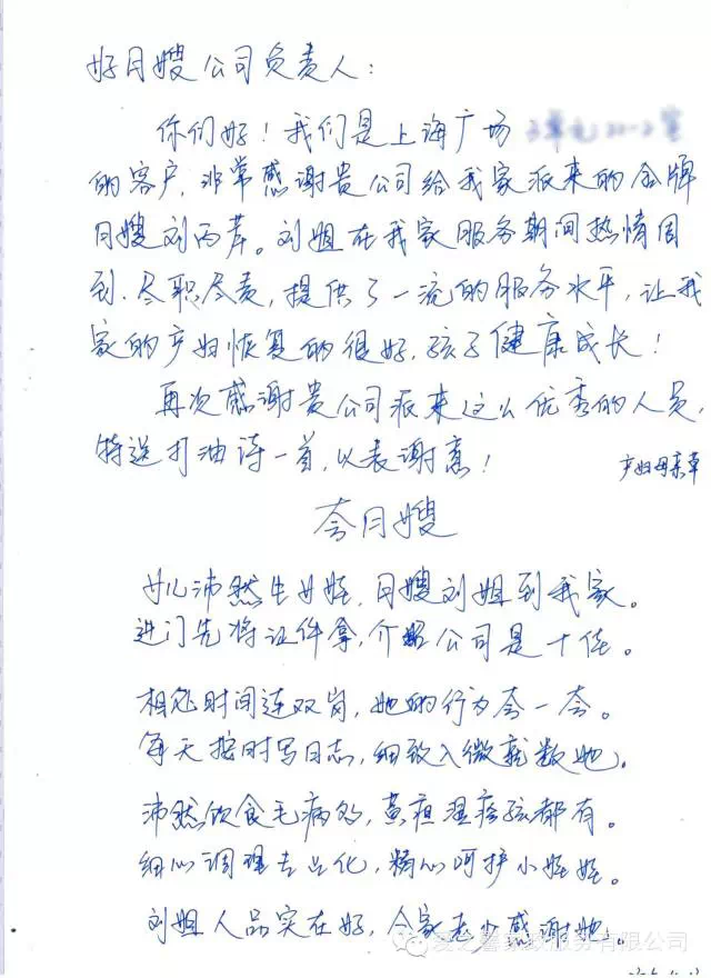 月嫂劉炳琴獲得客戶贈予的感謝信一封